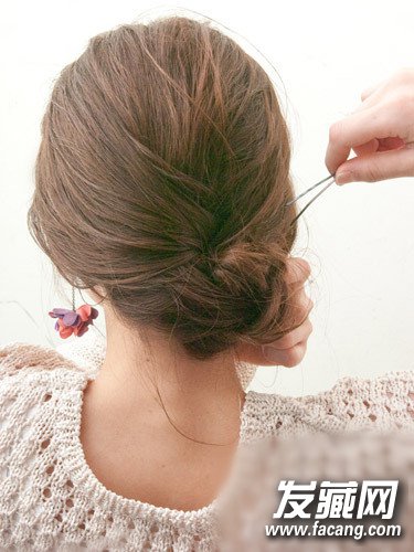 步骤六:将辫子缠绕成一个发髻,用发夹固定,最后可以搭配自己喜欢的发夹装饰。