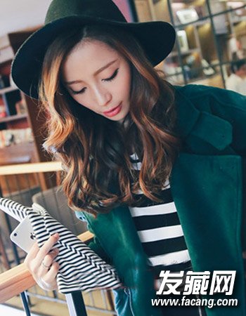 偏分的中长卷发发型,这种气质的大卷发型勾勒出无比的时尚感来,而且黄棕色的发色与墨绿色大衣搭配起来正是冬季再时尚不过的造型。
