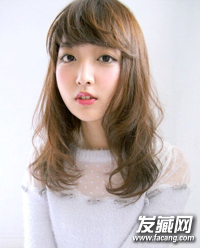 这款蓬松中长烫发十分清纯甜美,及眉的齐刘海遮住额头,缩小脸型,从视觉上达到瘦脸的效果,发尾烫出蓬松感也能提升气质。
