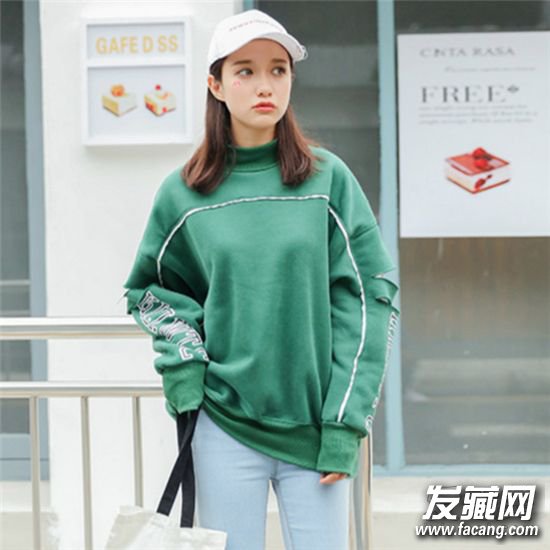 长度刚刚过肩,发尾剪裁整齐的中长发,很多妹子的首选发型,直发清新减龄,搭今年炒货店绿色显活力。