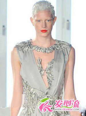 一眼看上去有点像雕塑一样的非主流短发发型,将头发漂染成白色,就连眉毛也不放过!搭上一抹红色的嘴唇,增添了几分魔女的气息!整体效果彰显出无尽的魄力和高贵的不俗的气质!
