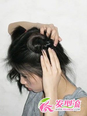 步骤三将卷好的头发盘起来绕在后面,用发夹固定!