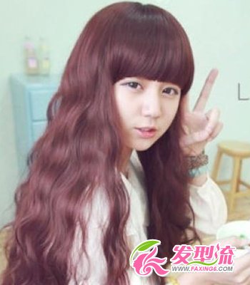 散落的波浪式长卷发如瀑布般倾泻而下,带着浪漫梦幻的气息。红色系的染发颜色非常靓丽抢眼,绝对吸引眼球。彰显出小女生的活泼俏皮个性,配搭减龄厚重齐刘海,活泼可爱的公主形象马上出来了,又可以很好地修饰脸型。
