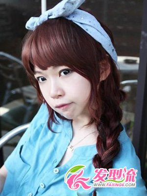 想要皮肤更加的白皙?那么当然不能错过这样一款酒红色额单编发造型啦!在原本具有染发的基础下,同样利用三股辫编制出一条粗壮的麻花辫子,为女生增添了可爱的气息!在齐刘海后三公分的位置扎上一根自己喜欢的发带,更显女生俏皮感!!
