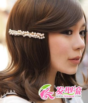 齐肩的秀发长度恰到好处,发尾打造出向上翻翘的效果,为整个发型注入了一股活力和灵动感,动感十足。厚重的斜刘海,有效减少了脸颊的面积,很好地修饰了脸型。长长的刘海用精美的镶满小珍珠的发饰别住,为发型增色不少。