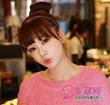 将秀发收拢高高扎在头顶,任意扭绕出丸子发髻状,让造型显得很是活泼可爱。轻薄的刘海修饰了脸型,同时又达到了扮嫩的效果。利用精致的细边发箍点缀发型,提升了女生的青春感,清爽的发型洋溢着活力的气息。