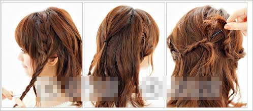 1. 脸周稍稍留些发束,两边侧面的头发编到耳边,然后分别编成小辫,发端用发卡夹好。