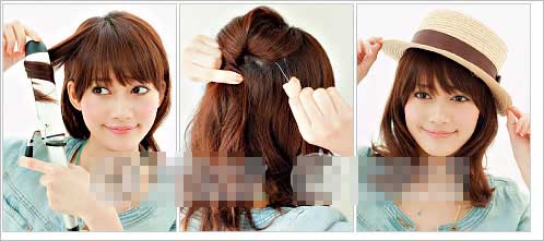 斜戴上浅色的休闲帽,是现在很流行的装扮哦。将头顶的头发旋转拧住,即使摘下帽子 也不失天真可爱的。
