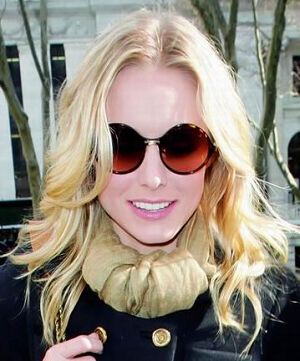 Kristen Bell的发型不像别人的发尾那么齐,而是有层次的大碎卷,配上纯金的发色,在阳光下格外得妩媚、跳跃,别有一番情调。