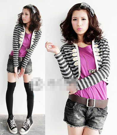春季穿搭:黑白条纹的高腰外衣搭配抢眼的高调紫色Tee、活泼个性的磨边牛仔热裤,让你出街造型回头率100%。