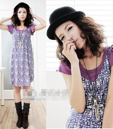春季穿搭:紫色打底Tee与紫色印花吊带裙 叠穿,搭配个性靴子 和复古气质的挂饰,让你绝对抢眼!