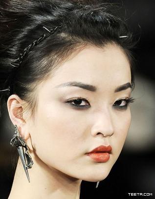 不管ZAc Posen的灵感来自哪里,在09秋冬的秀场,铆钉项圈摇身一变成发圈出现在了模特们的头发上。编织而成的发带上间隔着同色的金属铆钉,如果你仔细观察,会发现Zac给黑发的模特戴上了黑色铆钉发带(比如杜鹃),给金发的姑娘戴上了金色铆钉发带,棕发的则是咖啡色铆钉发带。虽然Zac很爱作秀,但是显然他还没有在追求现场夸张效果的路上狂奔不回头,铆钉发圈配合发色出现,令它们更加平易近人。