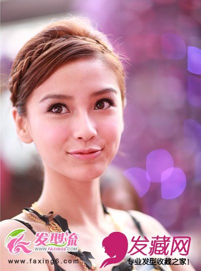 这款盘发发型,尽显Angelababy高贵优雅气质,在头发的一侧抓取出一小撮头发编制出麻花辫形状,盘至另一侧,高贵时尚,无刘海的发型设计,露出光洁的额头,使五官更显立体。