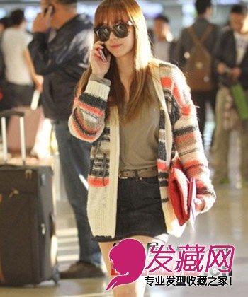 齐刘海直发发型,棕色染发,灰色内衣搭配牛仔短裙,外搭多彩条纹毛线衫,展示出一份甜美可人的少女气息。