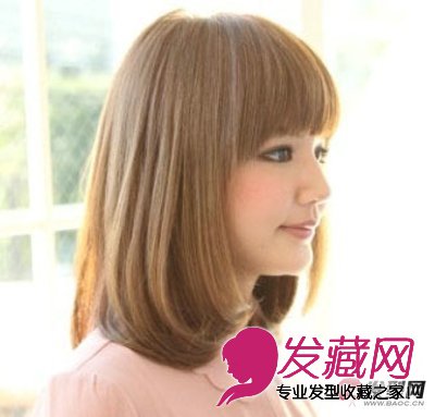发尾内扣的设计呈现包裹脸颊的弧度,加上厚重齐刘海设计,瘦脸减龄功效非常显著。发尾以上直发显得发丝柔顺有光泽,加上浅棕色的染发后增添了成熟感。