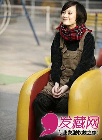 苏格兰大格子的围巾随意的系在脖子上,小短发配合背带裙和运动衫,孙俪就像一个大孩子一样清澈的微笑,干净的装扮。