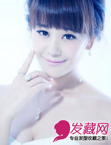 清新唯美的减龄齐刘海盘发,加抹胸白色礼服搭配纯洁动人的公主味尽显。