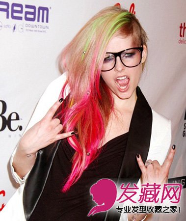 粉红色往往会带给人甜美、娇柔可爱的感觉。而摇滚精灵艾薇儿却将这种色彩混搭荧光绿的挑染,玩出了狂野不羁的叛逆朋克风。搭配灰色的烟熏和粗框眼镜,潮爆全场。