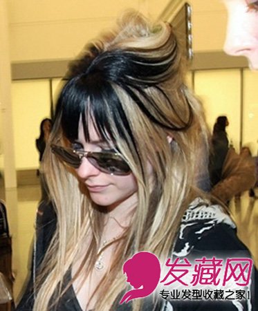 充满复古气息的高耸发髻半扎发,头顶处的黑色挑染处理,搭配复古墨镜,让艾薇儿朋克魔女的味道立即呈现。将顶部发丝盘成高高的发髻是关键。