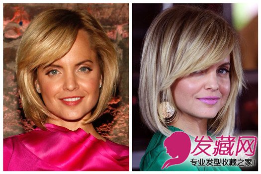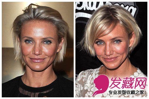右:Cameron Diaz选择斜刘海偏分Bob头看起来甜蜜范儿十足,更有女孩的气息。这款发型在之前头发的基础上用一支卷发棒就可以做到。