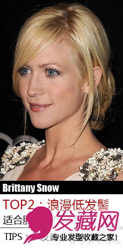 Brittany Snow这种浪漫的低垂发髻很适合到场一些需艳服出席的场所。把头发侧分后扎成低垂的马尾辫,将马尾盘起形成一个松松的发髻。用手指在头发上涂点护发膏,之后从发髻里拉出一些头发自然垂到面颊两侧。