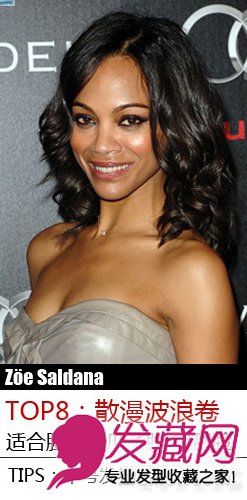 去约会,效仿下Zöe Saldana绝对没错,由于这款造型很性感。先用装了风筒的电吹风吹干头发,然后每次拉起约莫一英寸厚度的头发缠绕在中号发卷上,从耳部最先卷起,留根部不卷。让头发自然冷却,然后晃晃头将这些卷卷散开就能造出这种松散柔软的海浪了。