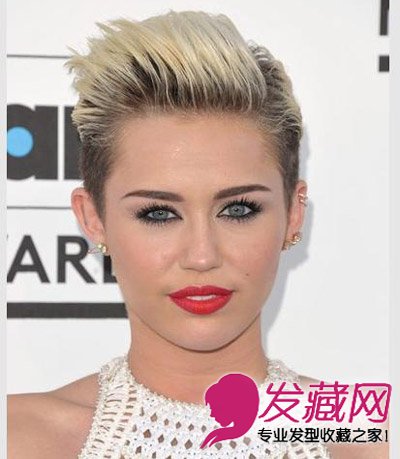 接近乳白色的头发全部向脑后梳,露出深色的发根,两侧剃短的头发依然也是深色,加上小烟熏眼妆和红唇,展现出女人个性的一面。