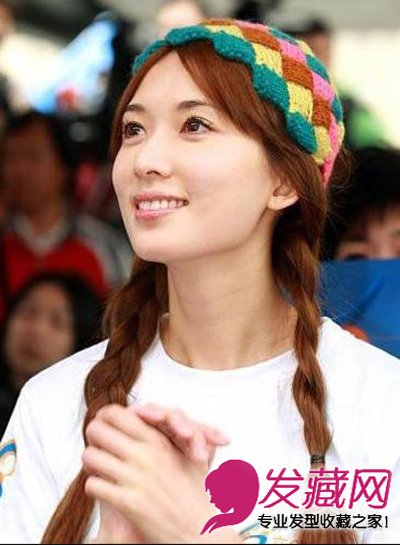 林志玲 林志玲栗棕色的秀发编成两根麻花辫,在帽子的装饰下显得格外甜美。
