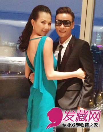张晋西装革履墨镜潮范十足,蔡少芬蓝色礼服公主头婉约大气,非常时尚的情侣造型。
