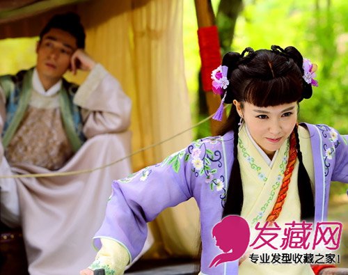 与现代造型那种傻里傻气相比,唐嫣的古装造型更火肯定,《仙剑》中痴情的紫萱可是女神范十足。现在《金玉良缘》中中唐嫣一改女神路线,变身刁蛮娇妻,与霍建华开始一段爱情之旅。粉嫩的紫色与鹅黄色相配合很显少女气质,唐嫣的这剧中的这款发髻造型也在古装中也你很是常见,两边紫色的花朵发饰更是甜美可爱到不行。