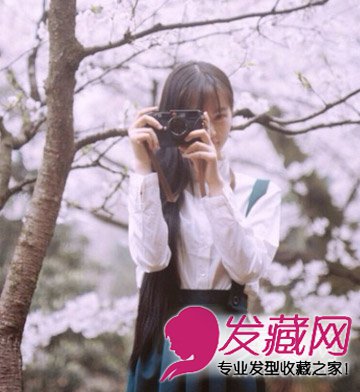 自然黑色秀发,恬静校园自然美女范,衬衫长裙,手持相机看起来就很文艺迷人。