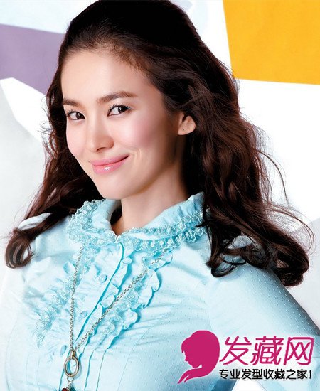 将巧克力色的公主烫卷发梳成公主头,露出光洁的额头,淡淡的妆容更显红润脸色,巧克力色头发更能提亮肤色,让宋慧乔更加清甜哦!