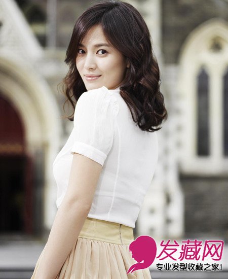 把巧克力色头发烫成梨花头,秀发显得丰满而富有弹性,稍微的中分搭配圆润的脸部轮廓,淡淡的笑容更显优雅。