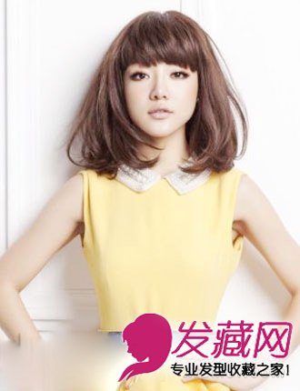 梨花头的邓家佳显得清甜可爱,时尚乖巧的中长款烫发,配合萌感的齐刘海,这款棕色梨花头绝对是是大热款。