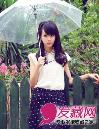 一条波点长裙搭白色雪纺衬衫,清雅端庄,微卷的长发,侧边编上麻花辫,更多了一份田园气息,白色透明的伞下美腻迷人。