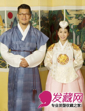 这款韩服头饰简单而传神,米黄色的服饰搭粉色的低裙尽显甜美气质,新郎韩服短发也很俊朗。