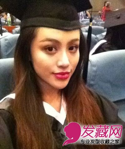 毕业照曝光,一头披肩的长发发型,棕色的染发颜色很是时尚抢眼,戴学士帽的样子很是斯文秀气。
