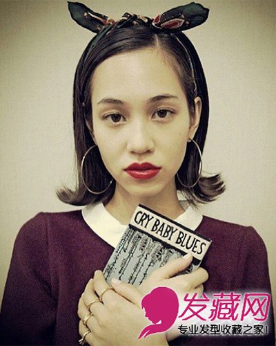 及肩短发,发尾剪齐外翘,蝴蝶结发箍为美丽加分,复古可爱。
