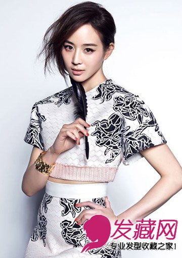 淑女风的扎发发型,长长的刘海的很好的修饰了脸型,不对称的扎发更显时尚感,搭配复古的套装更显修长。