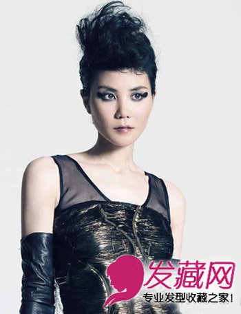 瓜子脸型,烟熏妆,高耸的盘发造型,打毛之后别具时尚个性,黑色皮裙,帅气有范。