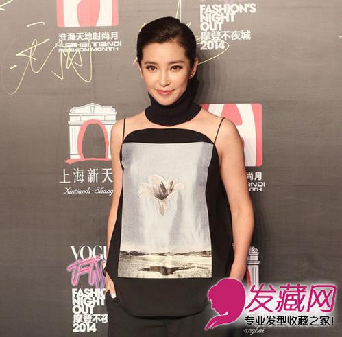 不久前,李冰冰亮相上海2014“VOGUE Fashion’s Night Out(FNO)摩登不夜城”开幕仪式。她一改往日披肩长发,正面将头发梳成三七偏分,十分复古时尚,英气逼人。而后面的长发利用围脖集中在一起,仿佛束起了低马尾一般。这种发型简洁大方明快,凸显面部轮廓,而李冰冰的五官精致,正正适合这个发型。