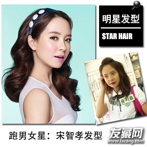 作为韩版跑男的固定女嘉宾,宋智孝也是会选择简单发型示人,蓬松烫发,将刘海挽到头顶,轻松随意。节目外的她韩式烫卷长发披肩,头戴发箍,加上精致妆容,女神范十足。