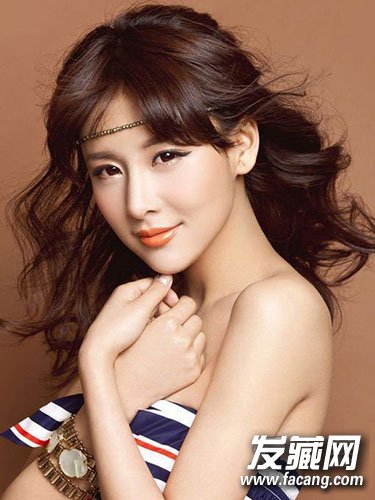 空气感刘海,栗色染发添加活力,蓬松卷发加上细绳配饰,显得很有异域风情。