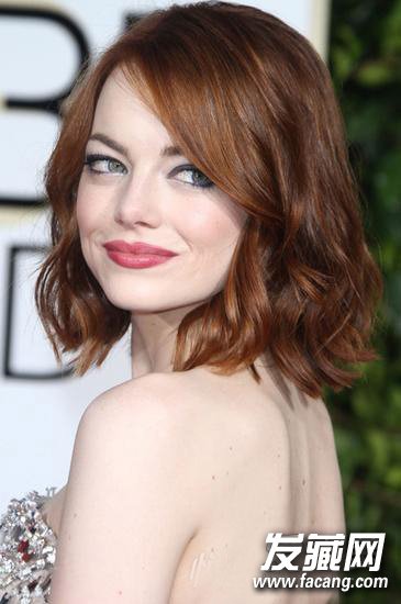 回归红棕色发色的Emma Stone(艾玛·斯通)显得更加光彩照人,韩式的烫卷发型在她身上也被运用得恰当无比。中卷齐肩的短发,极其富有时尚气息,从耳朵处做了内卷处理,让头发一缕一缕地扣在一起,显得更加青春逼人。斜斜的刘海,不对称的造型,富有慵懒气息和Emma Stone(艾玛·斯通)的独特味道。