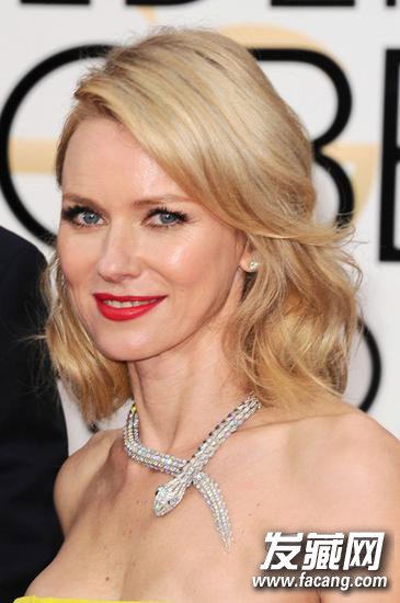 曾经以《金刚》女主角活跃在大荧幕上的Naomi Watts(娜奥米·沃茨)依然优雅无比,金发形象深入人心。前额部分的头发全部侧分至一侧的处理,让她的发型保持了轻柔的优雅感觉。及肩的细节处理仍旧保持了轻柔优雅感。飘逸的头发将Naomi Watts(娜奥米·沃茨)的时尚感提升了一个层次,整个人一如既往地美丽。