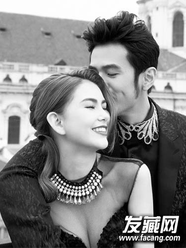从曝光的婚纱写真里,昆凌侧分的长刘海,整齐的烫卷发半扎起,眯上眼睛偎在周杰伦的怀里,脸上洋溢着幸福的笑容。