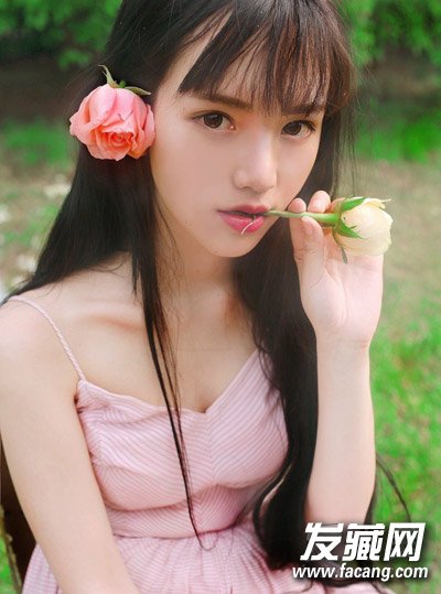 鲜花和美人永远是最合适的搭配了,自然的长直发将女生的宁静之美渲染到极致,一身粉色格纹吊带裙更显甜美气质。