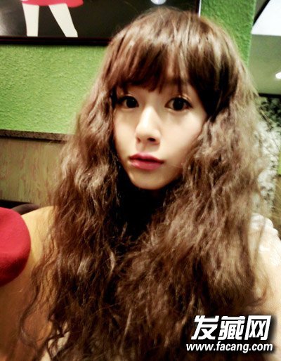 很夸张的玉米烫发型,齐刘海搭配长卷发变身非主流少女,夸张中张扬青春魅力。