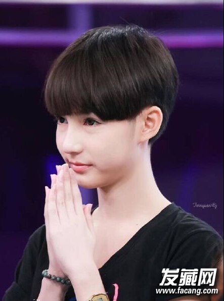 白嫩的肤色,无辜的大眼睛,笑容清纯乖巧,柔顺的直短发造型,尽显中性的清秀之美。