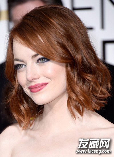 Emma-Stone的短款烫发很时尚,暖棕色的发色充满莹润光泽。